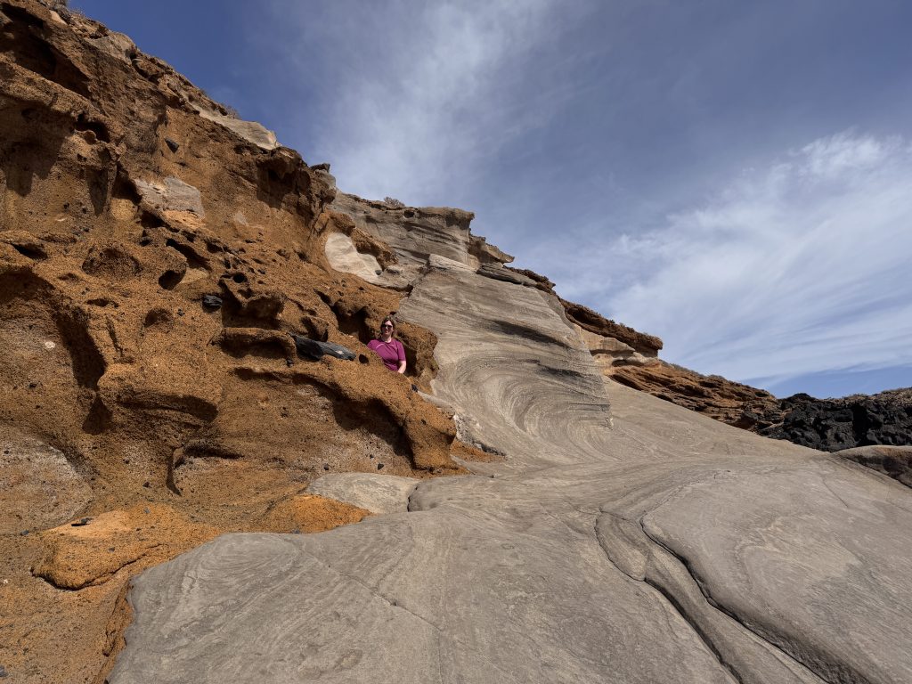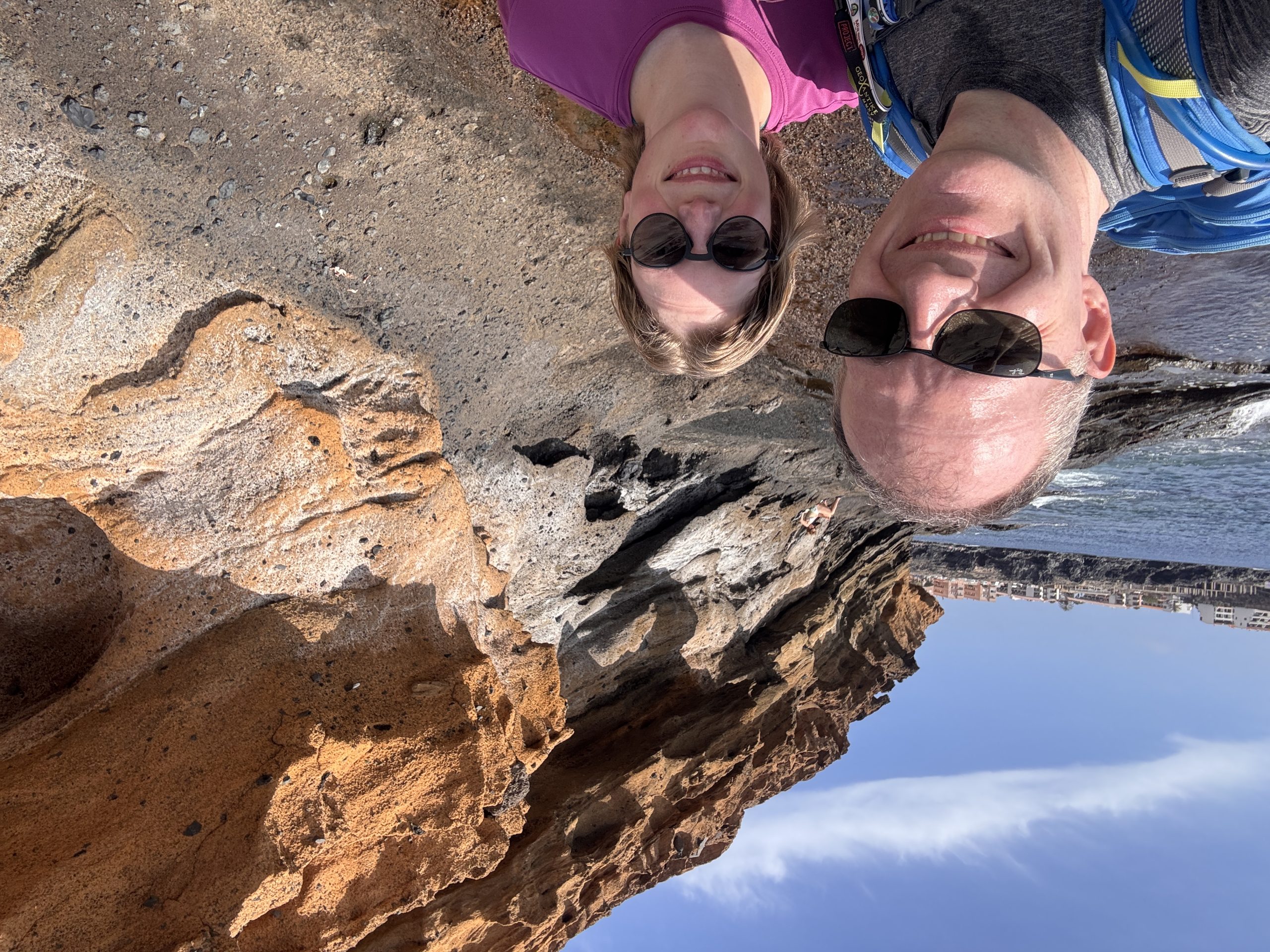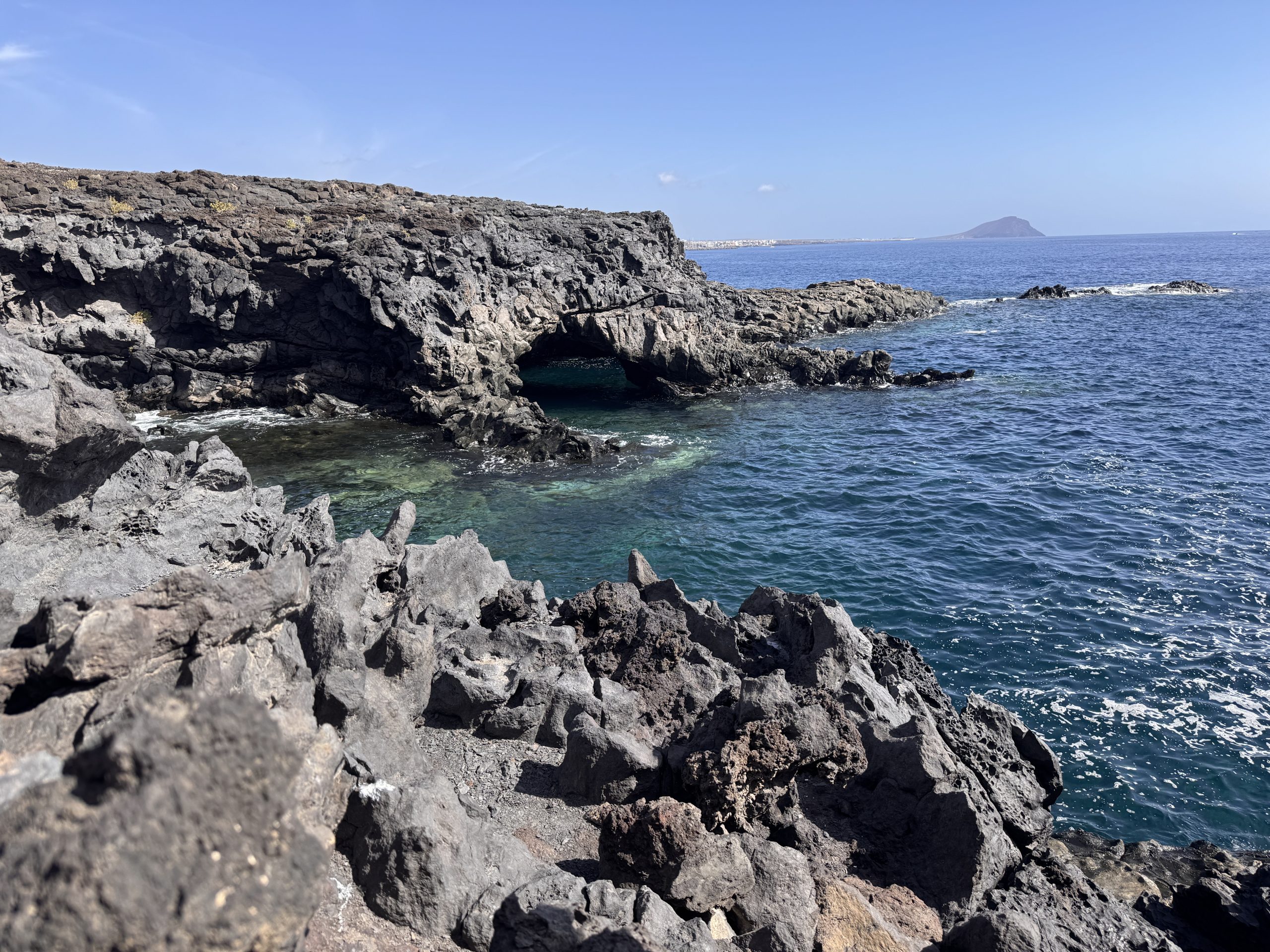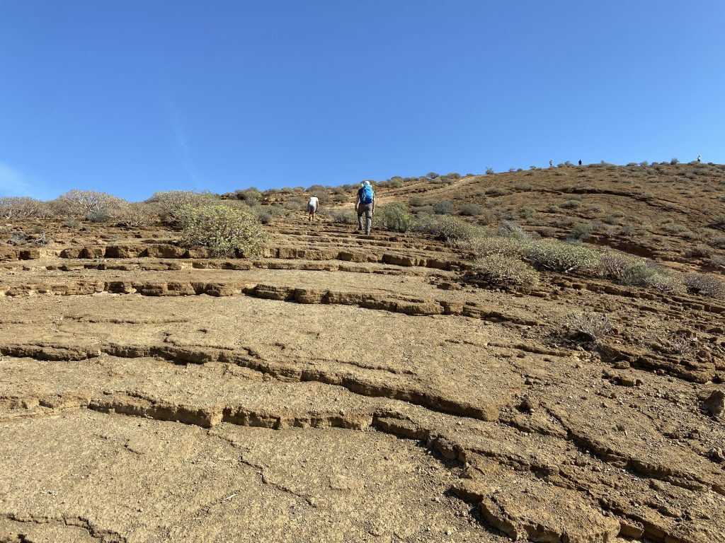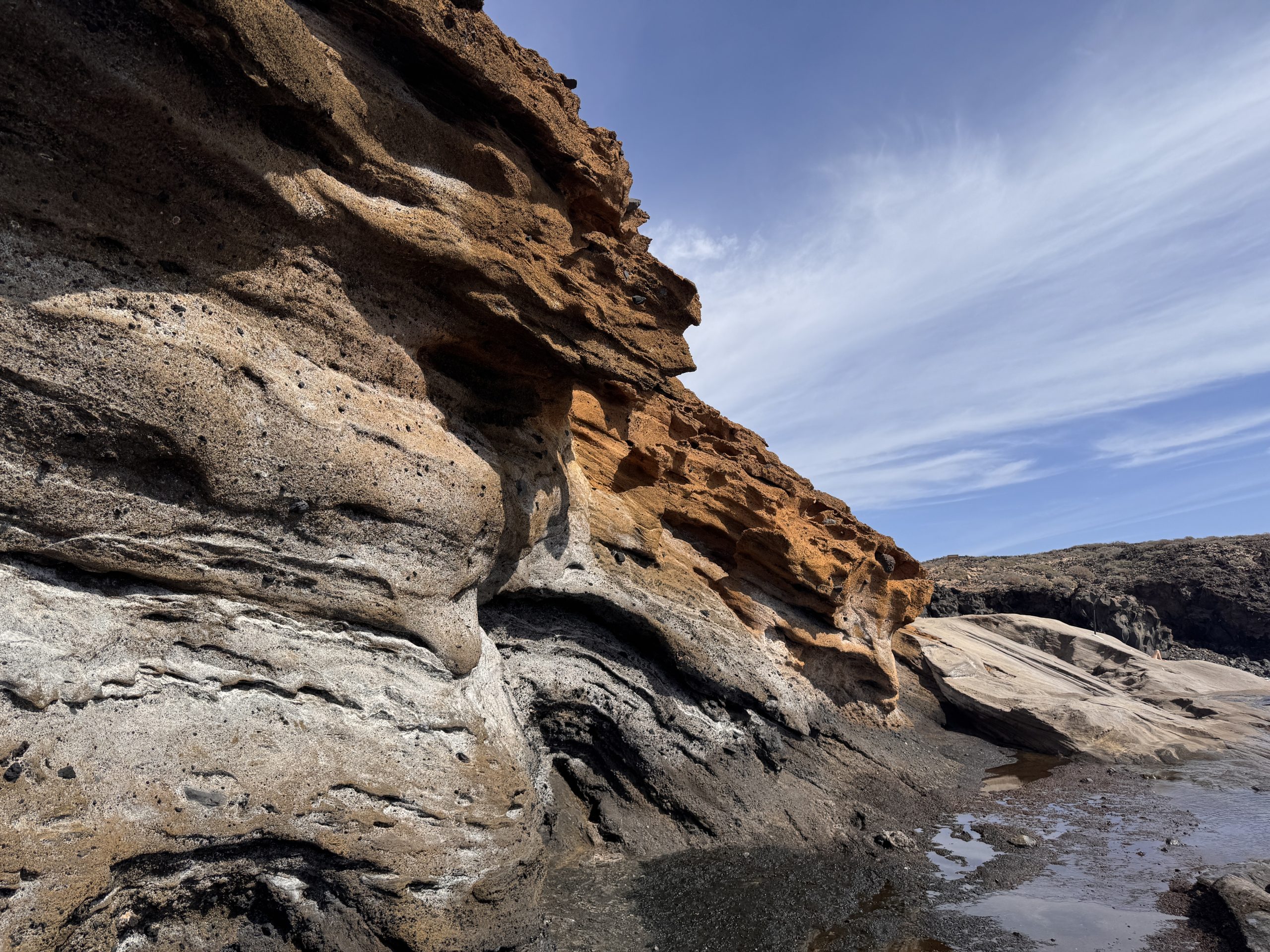 Unser Tag begann (nach dem wie immer guten und ausgiebigen Frühstück) mit der Fahrt zur Playa de Montaña Amarilla, einem sehr schönen und interessanten Küstenabschnitt. Vor Ort haben wir uns die berühmte Küstenlinie mit der ausgewaschenen versteinerten Düne angesehen und sind auch „ein paar Schritte“ (und Höhenmeter) gelaufen. Das Wetter war an der Küste wieder erdrückend heiß und schwül, sodass das Laufen nicht das pure Vergnügen war – aber die Landschaft hat das mehr als wettgemacht (und am Ende ist das ja – wie Michi schon feststellte – Jammern auf hohem Niveau 🙃).