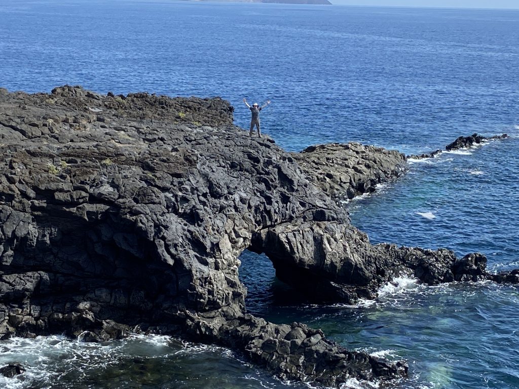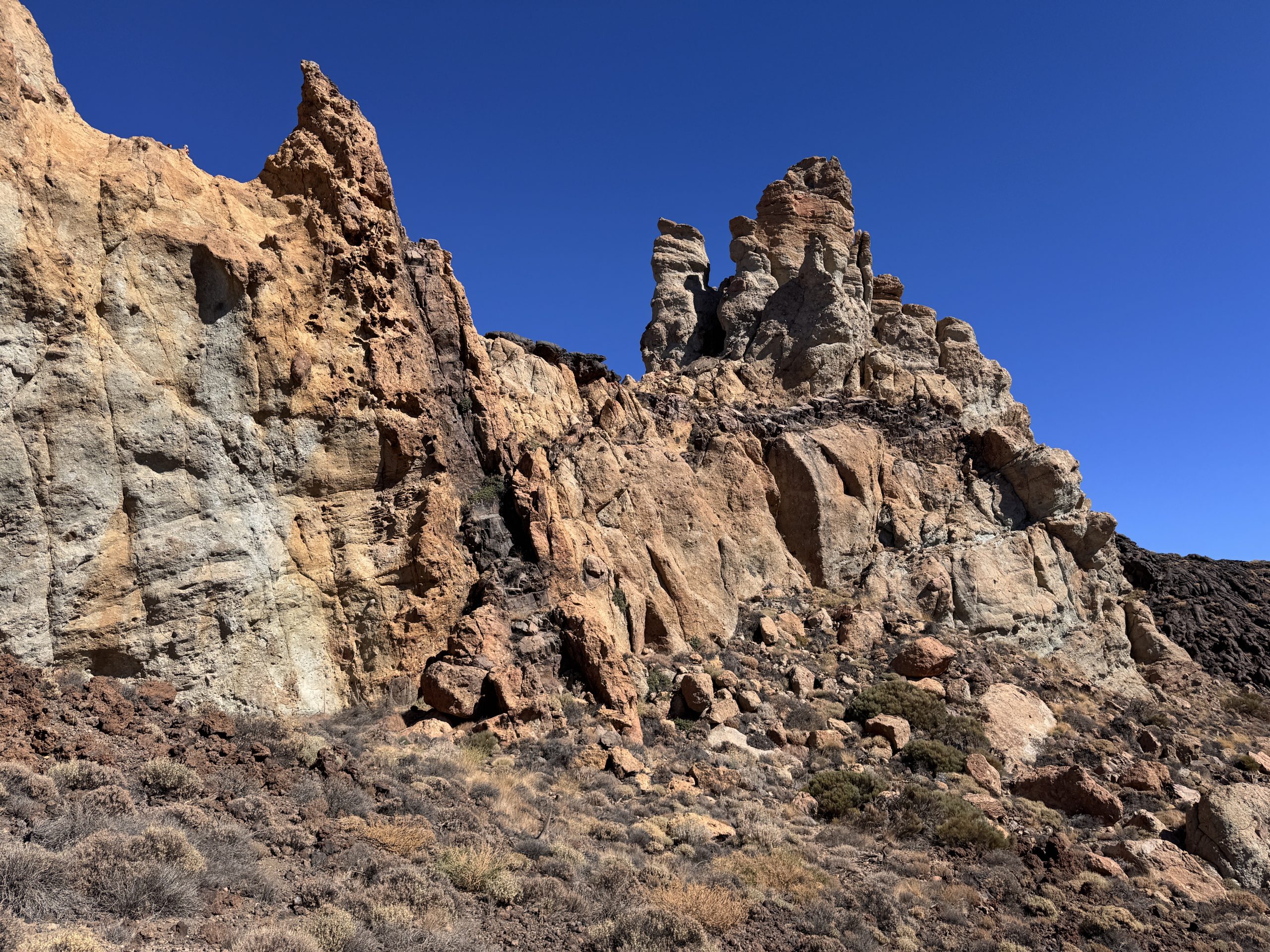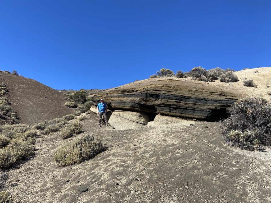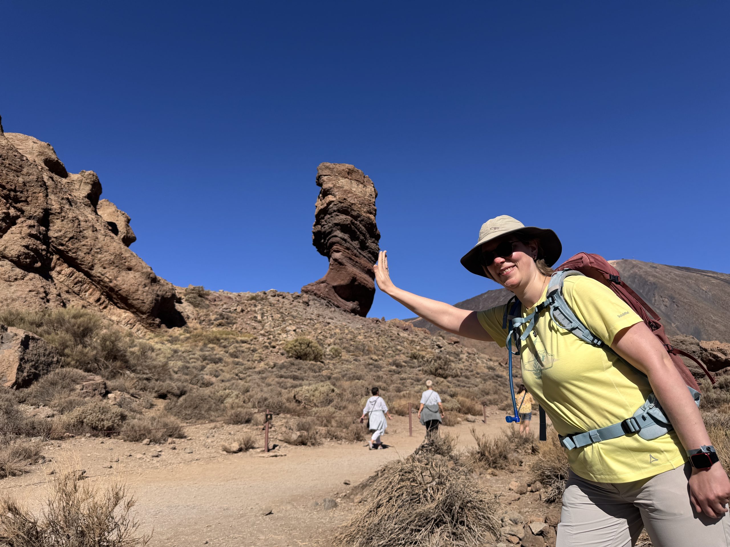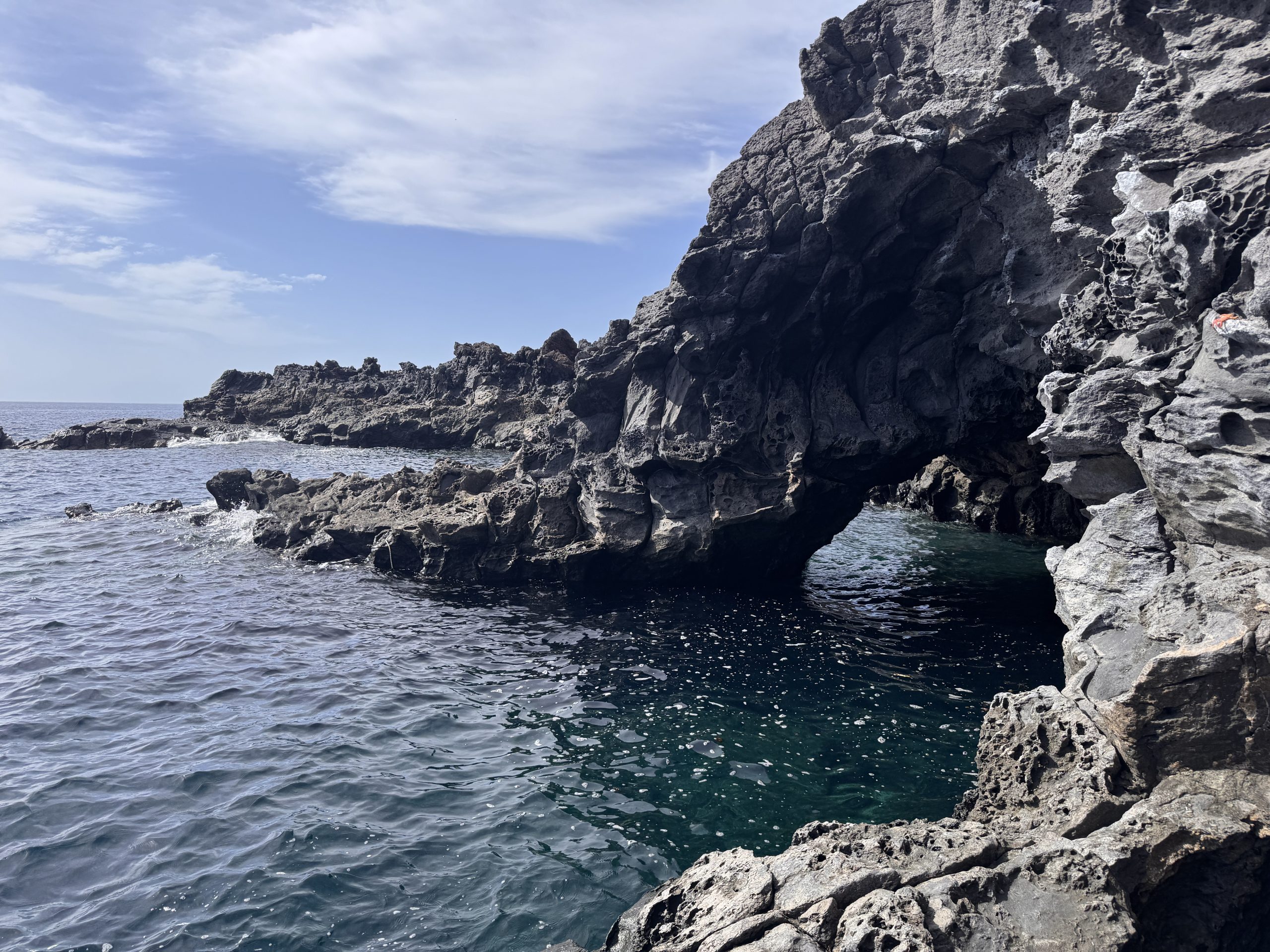 Unser Tag begann (nach dem wie immer guten und ausgiebigen Frühstück) mit der Fahrt zur Playa de Montaña Amarilla, einem sehr schönen und interessanten Küstenabschnitt. Vor Ort haben wir uns die berühmte Küstenlinie mit der ausgewaschenen versteinerten Düne angesehen und sind auch „ein paar Schritte“ (und Höhenmeter) gelaufen. Das Wetter war an der Küste wieder erdrückend heiß und schwül, sodass das Laufen nicht das pure Vergnügen war – aber die Landschaft hat das mehr als wettgemacht (und am Ende ist das ja – wie Michi schon feststellte – Jammern auf hohem Niveau 🙃).