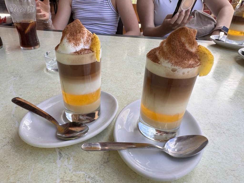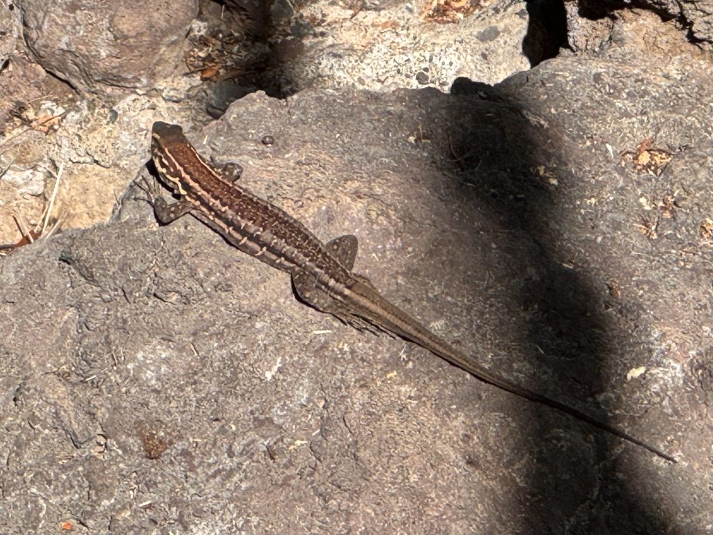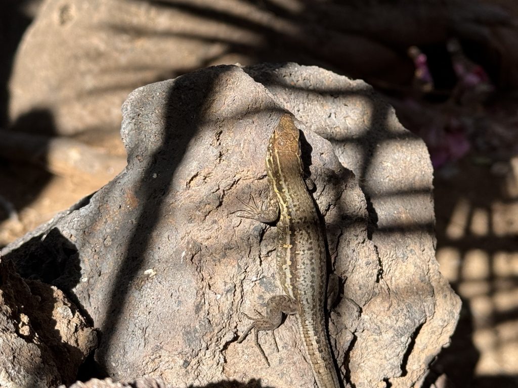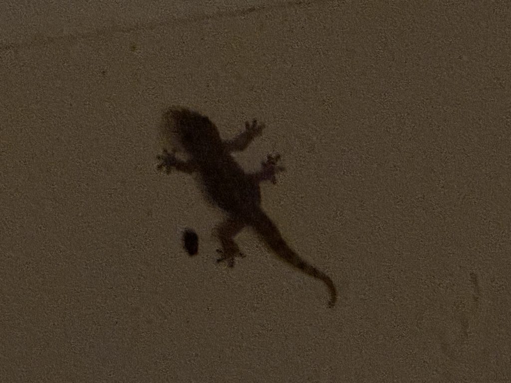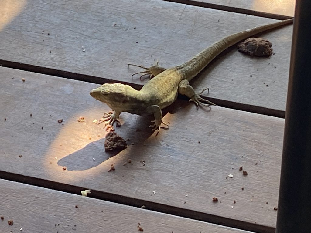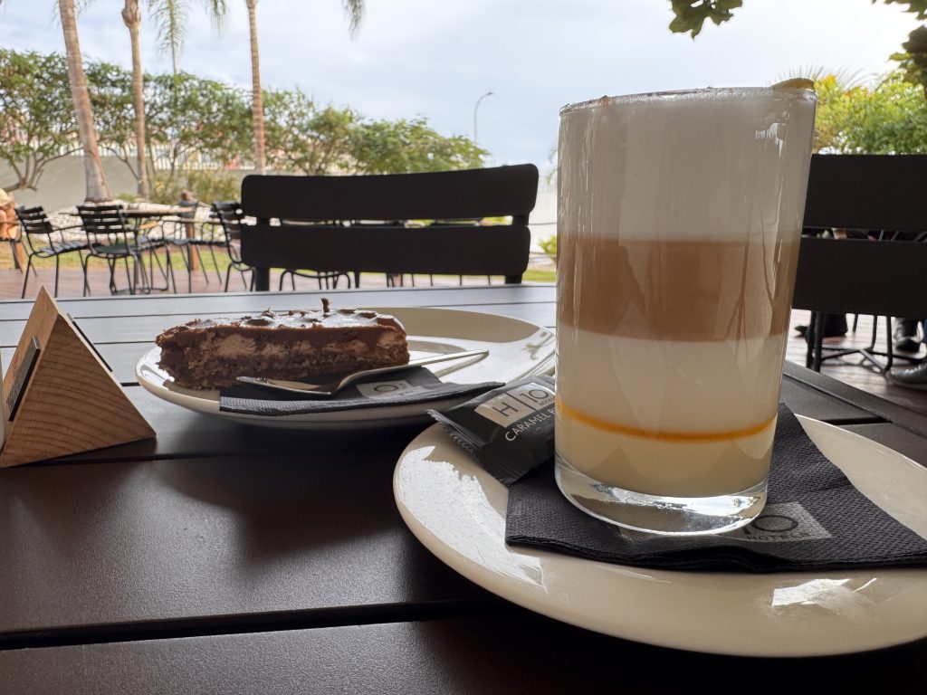 Am frühen Nachmittag haben wir uns dann im Café im Hotel einen Barraquito bzw. einen Coco-Coffee und jeweils ein Stück Kuchen gegönnt. Dabei tauchte plötzlich eine der hoteleigenen Eidechsen auf – ein Mords-Oschi! – und tat sich an den Kuchenkrümeln gut, die unsere Vorgänger großzügig am Boden verteilt hatten.