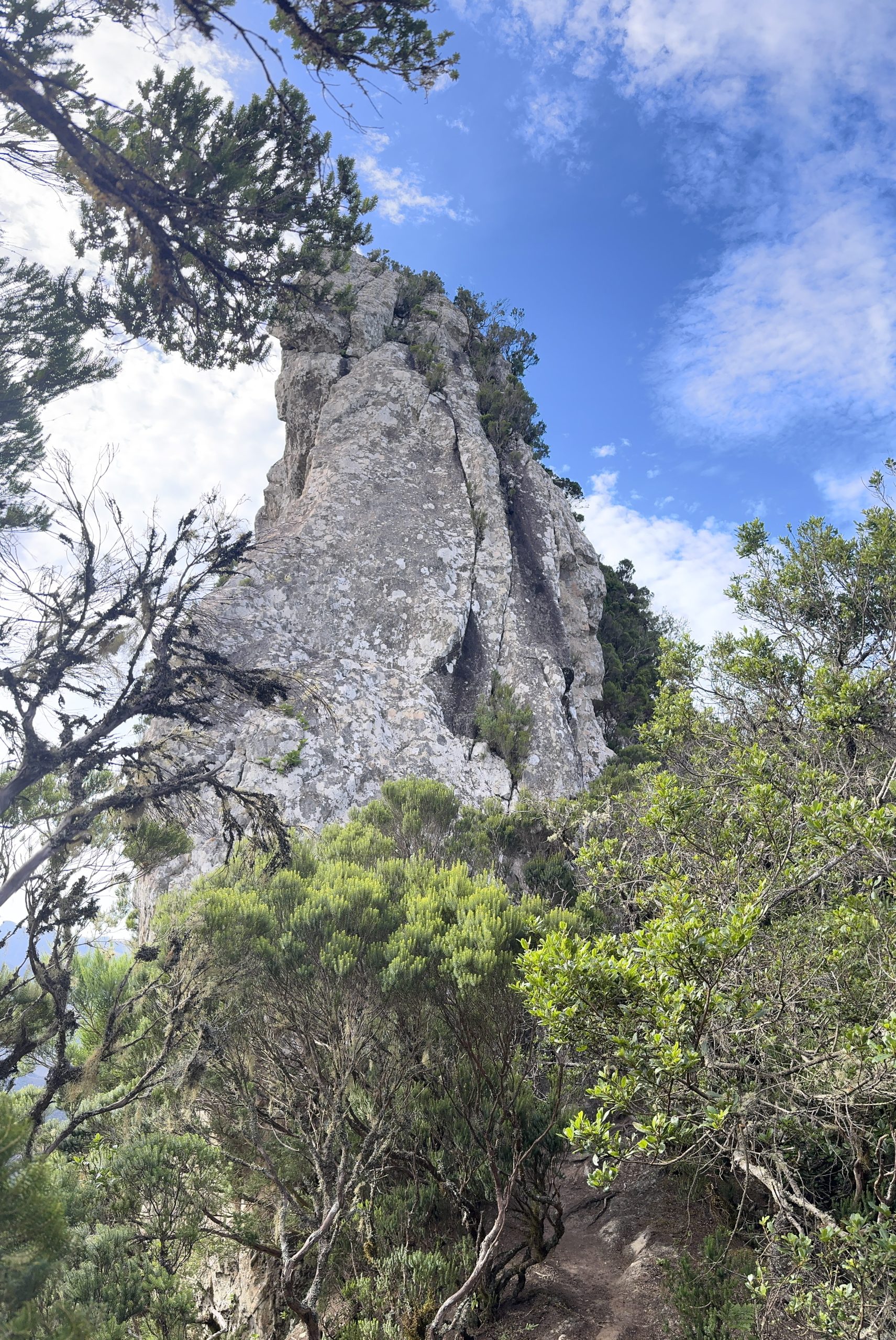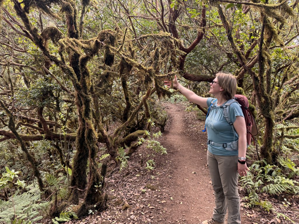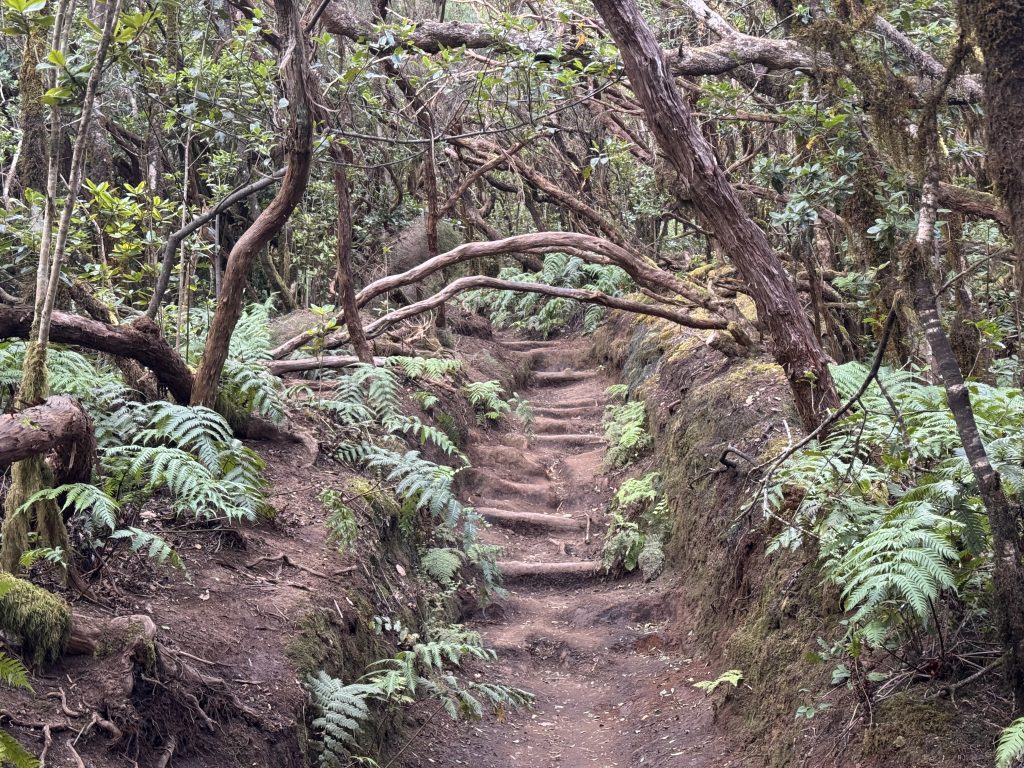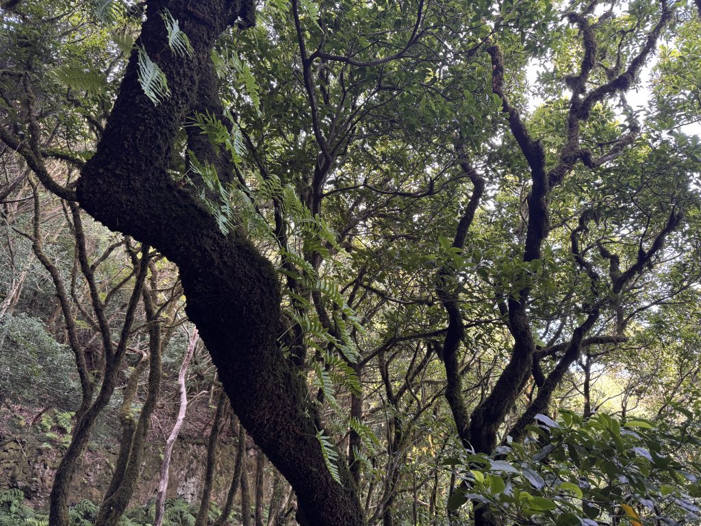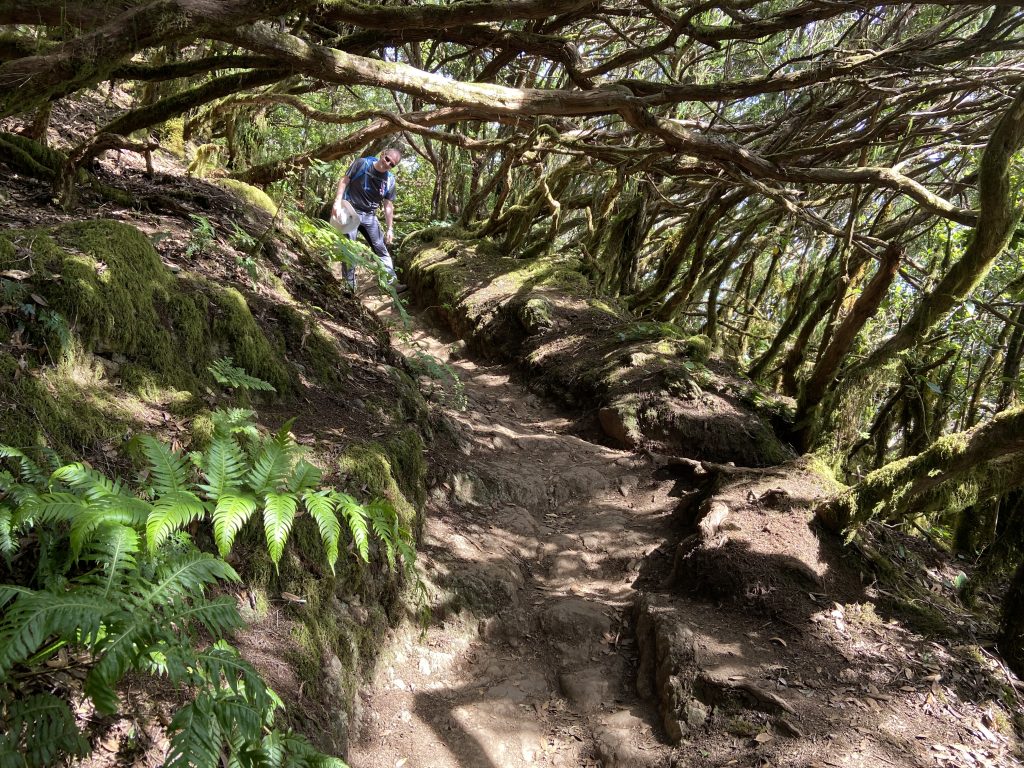 El Pijaral erstreckt sich über ein stark erodiertes Gebiet mit äußerst steilen Hängen, tiefen Schluchten und fast senkrecht abfallenden Felswänden. Aufgrund dieser Merkmale ist dieses Gebiet nur schwer zugänglich, was die Erhaltung seiner natürlichen Ressourcen begünstigt. Das Gebiet zeichnet sich durch seine Pflanzenvielfalt aus. Vorherrschend sind Lorbeerbäume, die mit Moosen und Flechten bewachten sind – Michael müsste sich von La Palma an einen ähnlichen Wald erinnern. Außerdem viele Farne und weitere Pflanzen. Die besonderen Tierarten – Spinnen und sonstige Kriech- und Krabbeltiere – haben wir aber lieber gemieden. 😉